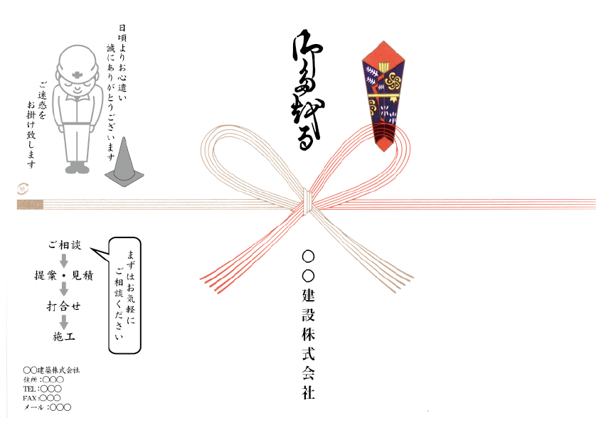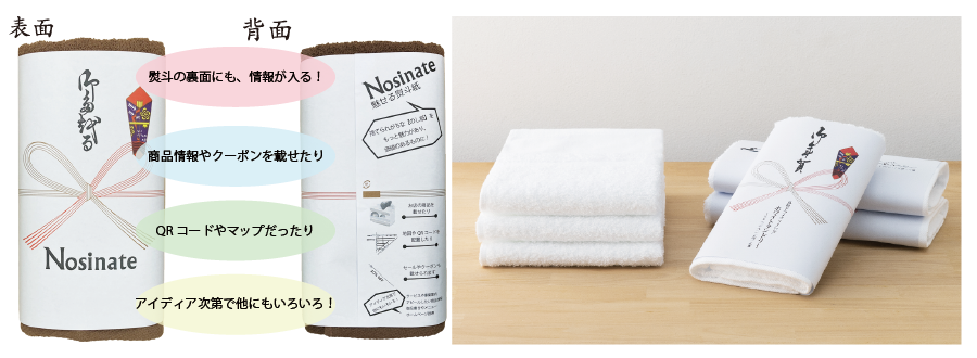 ご挨拶タオルの熨斗紙に社名印刷だけでなく、背面にメッセージや会社PRなどを表現できます。
