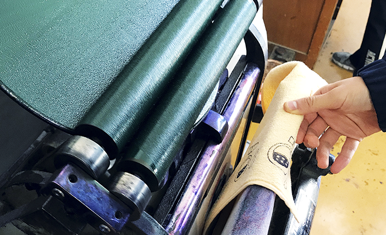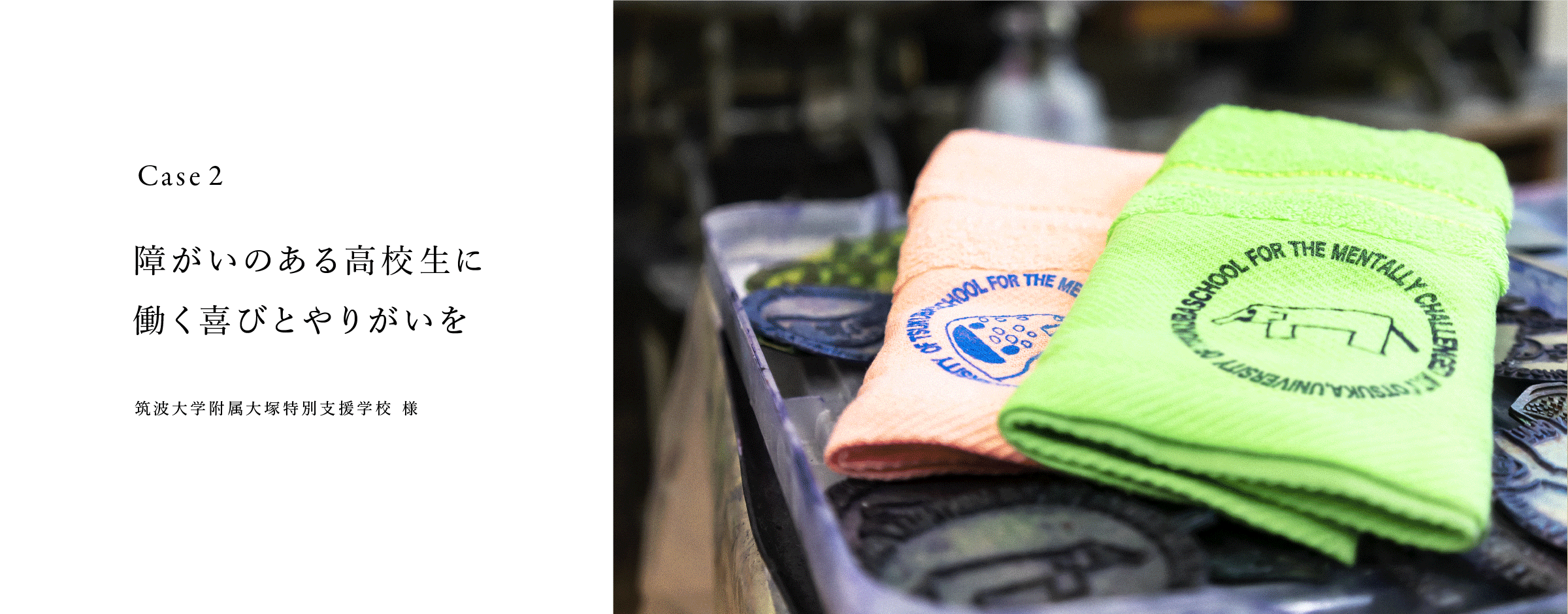 知的障がいのある子供たちの特別支援教育を行っている筑波大学附属大塚特別支援学校。日東タオルは、高校生の就職を見据えた授業を、タオルに関する知識と技術でお手伝いしています。このカリキュラムでは実際に販売する商品を制作し、タオルの印刷だけでなく、仕事の分担や流れ(アイロン、検品、印刷、袋詰め)、イラスト制作、在庫確認、販売など幅広い内容を含みます。印刷用のイラストを描く授業ではその絵柄から先生と生徒の間でコミュニケーションが生まれたり、文化祭の販売では生徒がオススメポイントを生き生きと話したりと、楽しみながら働くことについて学んでいるそうです。親御さんにも好評で、文化祭の定番商品に。昨年入学した生徒に学校で挑戦したいことを聞いたところ、タオルづくりと答えたと伺っています。